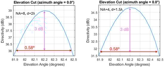 Elevation cut for azimuth angle = 0° for two of the directivity plots of Figure 14. On the other hand, the divergence of the φ angle is affected by the OPA topology, both by the number of elements NA and by their distance d. Increasing the NA reduces the φ divergence of the main lobe. Also, increasing the distance between adjacent elements reduces the main lobe φ divergence. It can also be seen in Figure 14 that increasing the number of elements (for a fixed distance) will result in the appearance of more side lobes with lower peak directivities, while the width of the main lobe is reduced. A similar effect is observed when the number of elements is kept constant and their distance is increased. In this case, more side lobes appear, and their peak directivity is also increased. Lastly, from the directivity plots, the peak directivity value can be extracted. This is 34.8 dBi for NA = 4 and d = 1.5λ and 35 dBi for NA = 8 and d = 1.5λ.