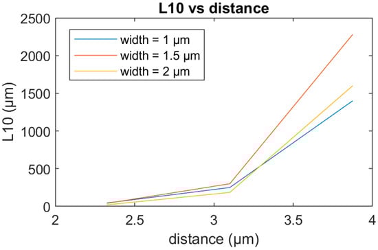 Is it worth noting that there is another limiting factor for the distance d. This is the crosstalk between adjacent grating elements, which is affected by both the waveguide widths and their distance. If d is too small and the grating length is adequate for the power to couple from one grating to the other, there will be interference that will degrade the performance. To estimate this effect, FDE simulations were performed in which two waveguides were placed next to each other and the L10, which is the length required for 10% of the power to couple from waveguide 1 to waveguide 2, was calculated. This simulation was performed for different values of d and across the entire range of the investigated grating widths. The results are shown in Figure 16. To interpret the results, two things have to be considered that act simultaneously and affect the value of L10. On the one hand, for smaller widths, the same d (x-axis in Figure 16) means a bigger distance between the waveguides. At the same time, bigger widths mean better confinement of the mode in the waveguide, and therefore, smaller interactions between the adjacent waveguides. These two factors have opposite effects on the value of L10.