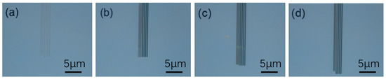 To investigate and analyze the processing issues, a line structure was designed for exposure on a silicon nitride substrate, which consist of a top layer of 700 nm silicon nitride on silicon substrate. An electron beam with an acceleration voltage of 100 kV was utilized to generate a high-speed electron beam for lithography, enabling penetration through various thicknesses of photoresist during exposure. Given that silicon nitride is commonly used in research for the fabrication of waveguide structures, it was essential to retain the photoresist as a mask in the exposed areas while etching the unexposed regions. Therefore, negative photoresist 7520.17 was chosen for the exposure process. Following the standard spin-coating procedure, a photoresist thickness of 800 nm was achieved. Subsequently, the silicon nitride substrate was exposed, and after development, select structures were characterized using an optical microscope, as depicted in Figure 5. The exposure doses for the structures ranged from 500 μC/cm2 to 850 μC/cm2 in 50 μC/cm2 increments. Compared with Figure 1 through intensity differentiation, these eight structures, exposed to different doses, exhibited a uniform color, indicating that they have been sufficiently exposed. Moreover, Figure 5 presents a wider range of exposure doses (500 μC/cm2 to 850 μC/cm2) than those used in Figure 1 and Figure 2 on the silicon oxide substrate.