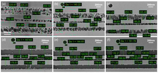 Figure 3 displays the structures exposed at various doses: 200 μC/cm2, 220 μC/cm2, 240 μC/cm2, 260 μC/cm2, 280 μC/cm2, and 300 μC/cm2. As mentioned earlier, there is a threshold for fully exposing the photoresist, which can be discerned through intensity differences in optical microscope images. When examined under a field emission SEM, the morphology of underexposed photoresist becomes even more evident, as depicted in Figure 3a–c. These images reveal that underexposed structures retain photoresist residues in a net-like form at the exposure sites. As the exposure dose increases, the density of this net-like photoresist diminishes, indicating the gradual breakdown of cross-links within the photoresist.