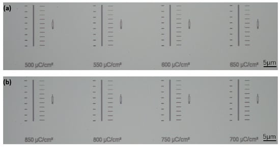 Optical microscope images of structures with the same design after exposure and development on a silicon nitride substrate (7520.17) using varying ranges of exposure doses: (a) 500 μC/cm2 to 650 μC/cm2; (b) 700 μC/cm2 to 850 μC/cm2.