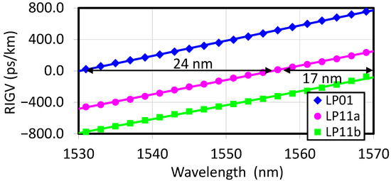 To calculate the phase-matching conditions for the processes 3 and 4, we need to use the horizontal shifts of ~17 nm (Δν1 = 2.1 THz) between the RIGV curves for LP11a and LP11b modes and ~24 nm (Δν2 = 3.0 THz) between the curves for LP01 and LP11a modes in Figure 2. The energy conservation and phase-matching conditions (momentum conservation) are shown, respectively, by Equations (4) and (5) below:
