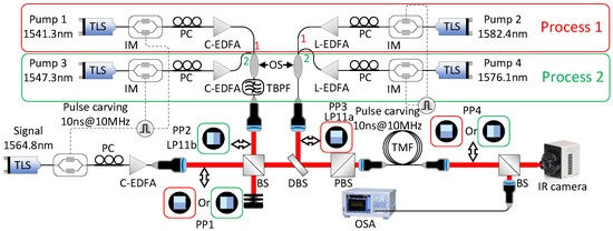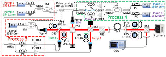 In our experimental demonstration, the wavelengths of the signal and idler are chosen to be at 1564.8 nm and 1558.4 nm, respectively, which results in pumps 1, 2, 3, and 4 placed at 1541.3, 1582.4, 1547.3, and 1576.1 nm, respectively, as calculated by Equation (3). The experimental schematic is shown in Figure 3. The input signal and pumps (Ando AQ4321, Ando AQ8201-13E, and three Photonetics 3642 HE1550 tunable external cavity lasers) are carved by intensity modulators (standard telecom 10 GHz modulators from JDSU, Covega, and Fujitsu) into 10-ns-long flat-top pulses with a 10-MHz repetition rate (10% duty cycle). The optical pulses are amplified by telecom-grade C- and L-band erbium-doped fiber amplifiers (EDFAs) and coupled from fiber to free space using three fiber collimators.