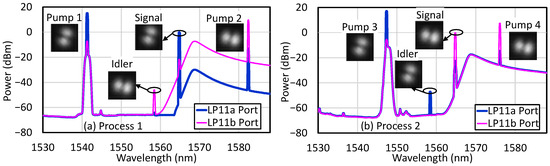 Figure 4 shows the spectra at the LP11a (blue traces) and LP11b (magenta traces) output ports of the TMF for processes (a) 1 and (b) 2. The significant difference in the idler powers of the two traces indicates high spatial-mode purity of the idler, which is better than 22 dB for process 1 and better than 31 dB for process 2 (after subtracting the background amplified spontaneous emission noise). The average powers inside the TMF are 0 dBm for the signal in all cases and 15, 9.5, 17, and 7.5 dBm for pumps 1, 2, 3, and 4, respectively.
