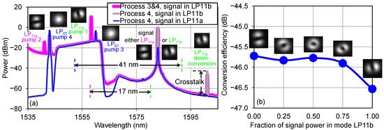Figure 6 and Figure 7a also show the spectra of the LP11b output port for processes 3 and 4 taking place simultaneously (i.e., when all 4 pumps are present) by the magenta traces. Average powers inside the TMF are 0 dBm for the signal and 10.5, 5.5, 9, and 7 dBm for pumps 1, 2, 3, and 4, respectively. At these powers, the CEs for processes 3 and 4 are nearly equal. If we had stable phase Δφ = (φp1 − φp2) − (φp3 − φp4), we would have been able to select for wavelength conversion a superposition of LP11a and LP11b signal modes with a specific relative phase, e.g., an OAM mode. Since the phase Δφ is also responsible for the direction of ωp1 + ωp4 = ωp2 + ωp3 phase-sensitive parametric amplification process among the 4 pumps (this process may require coupling a small fraction of pump 1 into the LP11a mode to meet the IM-FWM selection rules), it can be stabilized with a single phase-locking loop by monitoring one of the pump waves. However, such stabilization, typically relying on mutually coherent pumps derived from an optical frequency comb, is out of the scope for this paper, and our Δφ fluctuates randomly on a 0.1–1 µs scale. This means that we can observe mode-independent wavelength conversion of the signal, as both LP11a and LP11b components of any signal superposition are independently converted to LP11b mode at the new frequency and then added incoherently. This is illustrated in Figure 7b, which shows nearly the same CEs (within a 0.8 dB range from one another), measured for various signal superpositions with a weight of the LP11b component ranging from 0 to 100%.