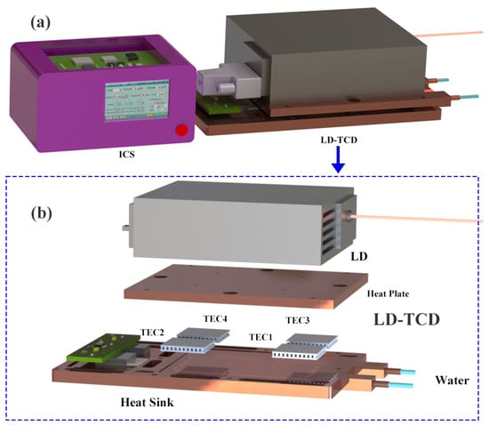 In the experiment, an intelligent control system (ICS) was employed as a terminal controller to monitor and control the real-time temperature of the LD through an LD temperature control device (LD-TCD). The designed intelligent LD temperature controller was shown in Figure 1a. To mitigate the effects of the ambient airflow and temperature drift [31,32] of the LD, the LD was placed in a relatively confined space. The structural details of the designed LD temperature control device (LD-TCD) are illustrated in Figure 1b. A heat plate was utilized to mount the LD to facilitate efficient heat transfer. The lower surface was closely attached to four thermoelectric coolers (TECs) with sizes of 40 mm ∗ 40 mm ∗ 3.45 mm for effective heat conduction between the heat plate and the heat sink. To achieve heat dissipation as soon as possible, the heat sink was equipped with microchannel water cooling and connected to a water circulation system. To prevent the devices from being damaged, the water flow rate was set to 6.2 L/min.