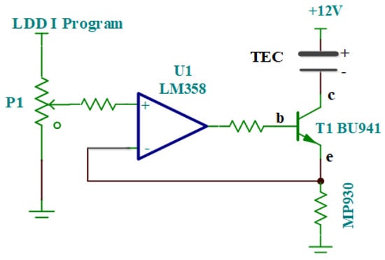 When the employed LD operated at a temperature of 25 °C, the emission wavelength [33] was centered at 888 nm [34]. The output power reached up to 110 W with a supply current and a voltage of 51 A and 3.95 V, respectively. In this case, the electrical-to-optical conversion efficiency was merely 54.6%, which meant that a thermal power of up to 91.5 W was generated. It was basically impossible to achieve fast temperature control for such a large thermal power by using the conventional PID controlling [35]. In order to overcome this problem, a constant-current-source circuit, depicted in Figure 2, was integrated into the conventional PID temperature-controlling circuit. And the whole framework of the control system is illustrated in Figure 3, which was implemented by utilizing a microcontroller unit (MCU) based on a digital signal processor (DSP) chip (TMS320F28069) for data processing and instruction execution. When the current of the drive source of the LD was continuously increased, the thermal power proportionally increased with the increase in the LD driving current. At this time, the constant-current-source circuit would provide a corresponding current to the TEC4 through its negative feedback loop according to the drive current of the LD to quickly control the temperature of the LD near the set value. Meanwhile, the system continuously acquired real-time temperature data using a thermistor TCS610 (NTC, 10 kΩ, 25 °C) and transmitted the data to the MCU. The MCU calculated the real-time temperature difference and generated a high-resolution pulse-width modulation (HRPWM) signal through the PID algorithm, which was transmitted to the DRV8432 to supply drive current to a set of parallel thermoelectric coolers (TECs: TEC1, TEC2, and TEC3), thereby mitigating systematic errors [36]. By adopting the developed control method, the system would reach a stable state as soon as possible.