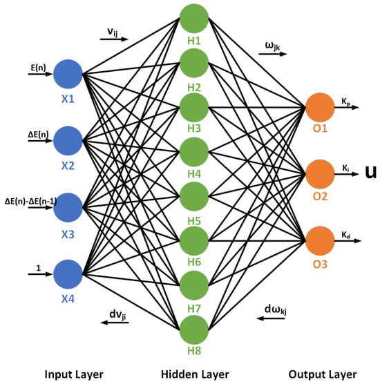 where and denoted the learning rate and the inertia coefficient, respectively. In our experiment, and . And the weights ( and ) were calculated by employing the sigmoid function (), the chain rule, and the incremental PID algorithm.