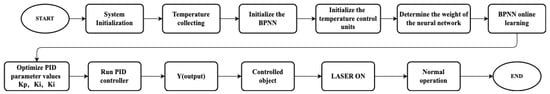 The BPNN-PID with ADAS is illustrated in Figure 5. Initially, the system started the temperature acquisition and calculated the system error. The BPNN algorithm was employed to optimize the PID parameters based on the real-time temperature difference, so that the control quantity was dynamically adjusted to make the LD temperature reach the set value as soon as possible. When the current was uploaded to the LD, significant heat was instantaneously generated, and a constant-current-source unit was employed to facilitate rapid cooling during the LD current injection process. Meanwhile, an adaptive dynamic adjustment strategy (ADAS) was developed to optimize the performances of the above two control units. In this case, when the error was the largest, reached its maximum value, whereas reached its minimum value. Then, and decreased and increased with the decrease in the error during system operation, respectively. In other words, when the temperature difference diminished, the influence of the first unit () gradually declined, while the influence of the second unit () progressively increased.