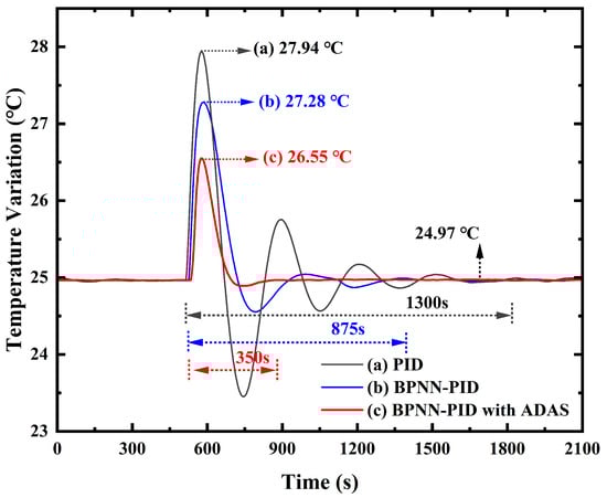 To systematically evaluate and compare the performances of the three temperature controllers, including the conventional PID controller, the BPNN-PID controller, and the BPNN-PID with ADAS controller, we meticulously recorded the temperature variation of an LD and the step response. Firstly, the temperatures of the cooling water circulator and the LD were set as 18.00 °C and 24.97 °C, respectively, and the parameter values of the conventional PID controller were set as . Based on extensive empirical testing, the values for and in our system were set to 1.2 and 1.5 in Equation (6), respectively. After achieving the temperature stability control of LD in 510 s based on the above three temperature controllers, the power supply current of the LD was rapidly increased from 0 A to 51 A (operating voltage: 3.95 V), the output optical power of the LD and the generated heat power were 110.95 W and about 100 W, respectively. In this case, the temperature variation trend was recorded and shown in Figure 6. It was seen that for the conventional PID controller, the maximum temperature reached 27.94 °C, and the temperature achieved stability after 1300 s (Curve (a)). When the conventional PID controller was replaced by the BPNN-PID controller, the maximum temperatures and the time achieving a stable state decreased to 27.28 °C and 875 s (Curve (b)), respectively. Further, when they were replaced by the BPNN-PID with ADAS controller, the maximum temperatures and the times achieving stable state decreased to 26.55 °C and 350 s (Curve (c)), respectively.
