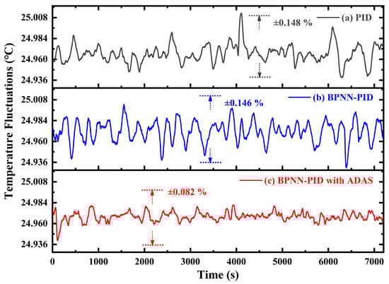 On this basis, the long-term temperature stability of the LD over 7200 s was also measured and illustrated in Figure 7. It was obvious to see that the temperature stability (Curve (c)) for the BPNN-PID with ADAS controller was better than ±0.082%, which was better than ±0.146% for the BPNN-PID controller (Curve (b)) and ±0.148% for the conventional PID controller (Curve (a)).