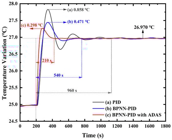 The step response of different controllers. (a) PID, 0.858 °C (Overshoot), (b) BPNN-PID, 0.471 °C (Overshoot), and (c) BPNN-PID with ADAS, 0.298 °C (Overshoot).