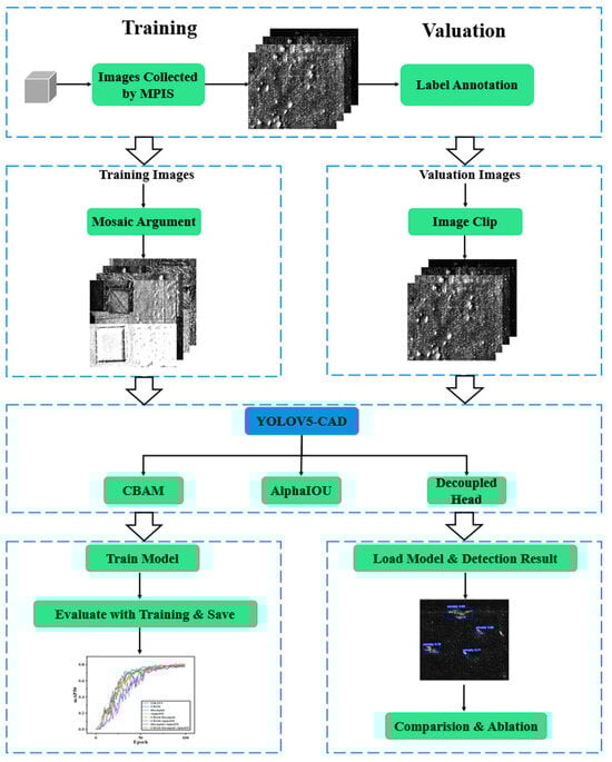 The structure of this paper is organized as follows: Section 2 introduces the defect image acquisition system and the implementation methods for defect detection experiments; Section 3 primarily describes the YOLOv5s model, which integrates the CBAM attention mechanism, AlphaIoU loss function, and decoupled detection head to form the YOLOv5-CAD model; Section 4 presents the experiments for training the defect detection model and analyzes the results; and Section 5 summarizes the study, discusses its implications, and outlines future research directions.