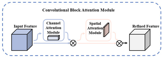 Additive manufacturing surface defects occupy fewer pixels in the image, are small targets to detect, and are susceptible to background factors and other factors [28]. To address the above problems, this study introduces the CBAM attention mechanism in the backbone feature extraction module C3 to enhance the detection ability of the backbone layer for target features [29]. The CBAM attention mechanism is trained by applying weights on the channel dimension of the feature layer extracted by the backbone network [30], which enhances the network’s ability to pay attention to defective features, suppresses useless information in complex background environments, and mitigates the impact of complex backgrounds on defect detection tasks [31]. The schematic diagram of the CBAM attention mechanism is shown in Figure 4.