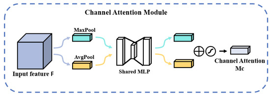 The CAM structure is shown in Figure 5. The input feature map F first passes through two parallel MaxPool and AvgPool layers to change the dimension of the feature map from C × H × W to C × 1 × 1, and then passes through the shared MLP module [33]. In this module, it first compresses the number of channels to 1/r times the original, then goes through the ReLU activation function, and then expands to the original number of channels. These two outputs are summed element by element and then passed through a sigmoid activation function to obtain the output of channel attention; then, this output is multiplied by the original map to change back to the size of C × H × W [34]. The formula for the above process is as follows: