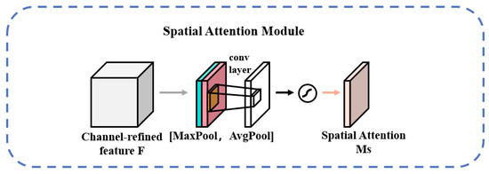 The SAM structure is shown in Figure 6. The output result of channel attention is obtained by maximum pooling and average pooling to obtain two 1 × H × W feature maps; then, the two feature maps are spliced by a Concat operation, and the number of channels of the feature maps is changed to 1 by 7 × 7 convolution; then, a sigmoid is used to obtain the feature map of spatial attention; finally, the output result is multiplied by the original input feature map and changed back to CHW size [35]. The formula for the above process is as follows: