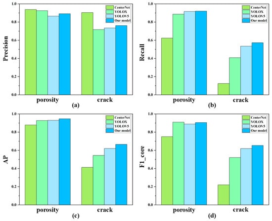 As clearly shown in Figure 9b–d, the proposed model improves the performance of two defect types in terms of precision, recall, mAP, and F1-score. Although the precision of the proposed model for porosity and crack detection is 4.56% and 14.31% lower than CenterNet, respectively, CenterNet’s other three metrics (recall, mAP50, and F1-score) are significantly inferior to the proposed model. Specifically, the proposed model achieves 44.84%, 25.2%, and 43.3% higher recall, mAP50, and F1-score compared to CenterNet. Additionally, the model’s detection performance for cracks is notably weaker than for porosity; this is likely due to the complex scale variations in crack features, which demand stronger multi-scale adaptability from the model. Despite improvements in crack detection after the proposed modifications, further optimization remains necessary. Overall, the proposed model demonstrates enhanced metrics compared to YOLOv5, validating the effectiveness of our improvements. Both longitudinal and horizontal comparisons confirm that the proposed model achieves state-of-the-art performance across all evaluation criteria.