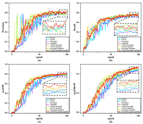 To intuitively demonstrate the impact of different modules on model accuracy, we conducted a series of ablation experiments based on YOLOv5 to validate the effectiveness of each module. First, we used YOLOv5s as the baseline model and obtained its detection results as the experimental benchmark. Subsequently, we modified the baseline model with different improvements to verify their individual contributions. Initially, we enhanced the C3 module in the YOLOv5 backbone network while keeping other components unchanged, ensuring that the results were not influenced by external factors. Following this approach, we validated each improvement method separately. Finally, all modifications were integrated to form the YOLOv5-CAD model, thereby confirming its overall effectiveness. The training process of the ablation experiments is illustrated in Figure 10, where curves of different colors represent the training results of models with distinct modification strategies. Additionally, Table 3 presents the outcomes of the ablation experiments, demonstrating the quantitative impact of each module on performance metrics.