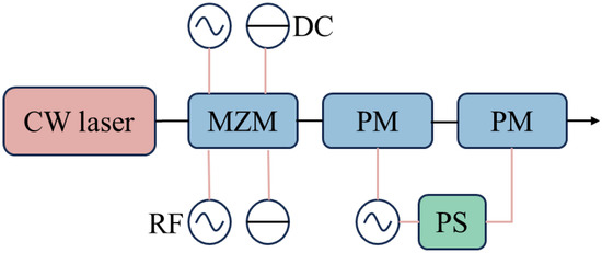 In this equation, represents the amplitude of the RF signal applied to the PM, while denotes the half-wave voltage of the PM. The expression above clearly shows that the resulting output optical signal consists of a series of harmonics when the CW light passes through the cascaded modulators. The amplitude of each harmonic is associated with the corresponding first-class Bessel function (which depends on the modulation index) and the magnitude of the modulation signal phase.