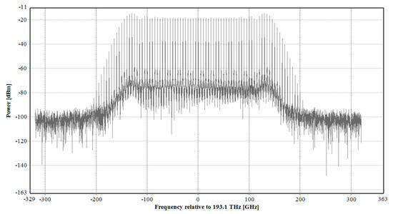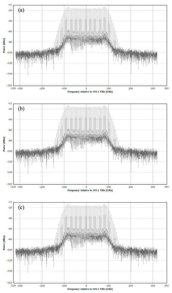 In the simulation system, the MZM’s 3 V and the extinction ratio was set as 45 dB. The of both phase modulators was 3 V. Considering the first restriction condition—that the input of each modulator did not exceed 2—we conducted calculations for configurations with 33, 31, and 29 comb lines. The results reveal that the flatness for the configuration with 33 comb lines was 3.2496 dB. For the 31-comb-line configuration, the flatness improved to 2.7472 dB. The configuration with 29 comb lines demonstrated an even better flatness of 1.3692 dB. These results indicate that the flatness improved as the number of comb lines decreased. The figure obtained from the simulation, which illustrates these findings, is presented in Figure 3. The flatness verification for 33, 31, and 29 comb lines is displayed from top to bottom.