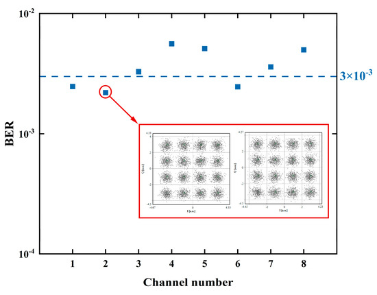 Figure 7 displays the optical spectrum before and after the fiber transmission, where we can observe that the channels appear flat. Figure 8 displays the bit error rate (BER) for the eight channels after the demodulation, along with the constellation diagram for the channel operating at a frequency of 193.15 THz. The results indicate that the BER values of the eight channels were similar. The inset shows precise and closely clustered constellation point distributions. This indicates that the optical signal retained good phase and amplitude characteristics during the transmission, which resulted in a low bit error rate and high transmission quality. Consequently, the signal integrity and stability of the system were effectively verified.