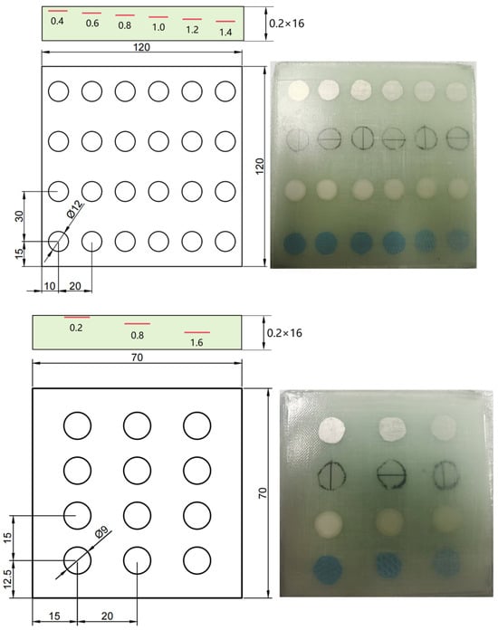 Two GFRP laminates designed and fabricated for this study are shown in Figure 1, serving as training and test samples. The specimens were made from G20000 unidirectional glass fiber prepreg, produced by Weihai Guang Wei Company, Weihai, China. Each layer had a thickness of 0.2 mm, and the external dimensions of the specimens were 120 mm × 120 mm × 3.2 mm and 70 mm × 70 mm × 3.2 mm, with a lay-up sequence of [0°/90°]8s. The GFRP specimen was cured at 120 °C for 12 h on the electric heating table. The inclusion defects are 12 mm diameter circular flakes in the training samples, arranged from top to bottom, consisting of metal, peel ply, release paper, and PTFE film. The defect depths, from left to right, were 0.4 mm, 0.6 mm, 0.8 mm, 1.0 mm, 1.2 mm, and 1.4 mm. Similarly, the inclusion defects are 9 mm diameter circular flakes in the test samples, from top to bottom, including metal, peel ply, release paper, and PTFE film, corresponding to the training samples. The defect depths, from left to right, were 0.2 mm, 0.8 mm, and 1.6 mm, respectively.