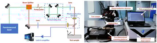 The experiment in this study utilized the QT-TO1000 terahertz tomography imaging system manufactured by Qingyuan Peak Reach Company, Qingyuan, China, as illustrated in Figure 2. The system consists of three main components: a femtosecond laser, emitter and detector, and a two-dimensional motor platform. The terahertz signal is generated by a photoconductive antenna and detected by low-temperature-grown GaAs (a photoelectric crystal). The system has a THz pulse width of 250 fs, and the time domain range is from 0 to 100 ps with 0.05 resolution. The system operates in a spectral range of 0.064 THz, with a frequency resolution of 20 GHz and a peak dynamic range of 80 db. The waveform Is sampled at a frequency of 500 Hz and the time sampling interval is 0.01 ps. During the experiment, the system should operate at a temperature of 20 °C ± 5 °C and a relative humidity of 20–40%. To ensure stable operation, strong sources of electromagnetic interference should be avoided whenever possible.