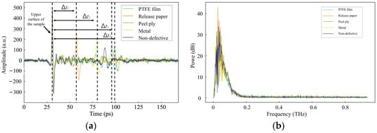 (a) Typical terahertz time-domain signals and (b) the corresponding spectral signals collected from different areas of the as-fabricated GFRP laminates. The dashed lines in (a) show the time delays between signals of the non-defective area and the four defective areas, which are calculated to be Δt1 = 25.2294 ps, Δt2 = 50.1619 ps, Δt3 = 68.849 ps, and Δt4 = 71.2844 ps, respectively.