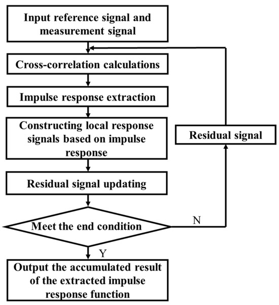 To address this challenge, deconvolution of terahertz signals is essential for extracting the impulse response function, enabling precise localization and characterization of defects in delaminated materials. This study proposes a deconvolution algorithm based on cross-correlation to extract the impulse response function from terahertz time-domain signals. The algorithm leverages the correlation between the reference and measured signals. The flowchart of the algorithm is shown in Figure 5, with the specific steps outlined as follows: