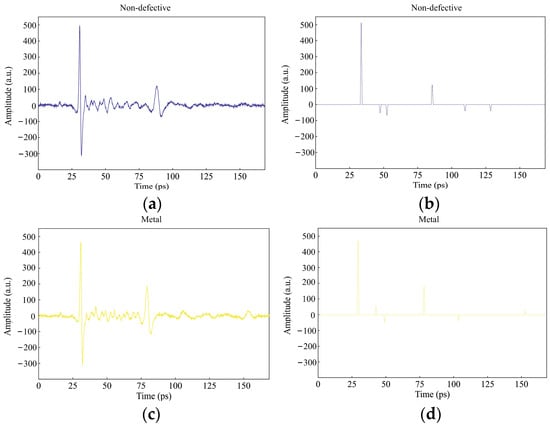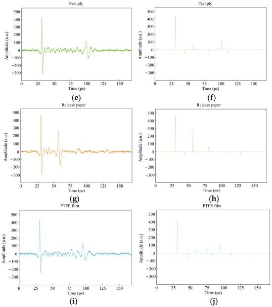 The proposed algorithm processes typical terahertz time-domain signals from four types of inclusion defects and defect-free regions. The reconstructed impulse responses are displayed on the right side of Figure 6. The convolution results obtained from the cross-correlation algorithm indicate the time of flight of the terahertz impulse response within the sample. The figure demonstrates that the algorithm effectively extracts impulses from the upper and lower surfaces of the material, as well as from inclusion defect regions. Additionally, the convolution results clearly depict the change in reflectivity sign caused by the variation in the reflectivity index from GFRP to inclusion defects and back to GFRP.