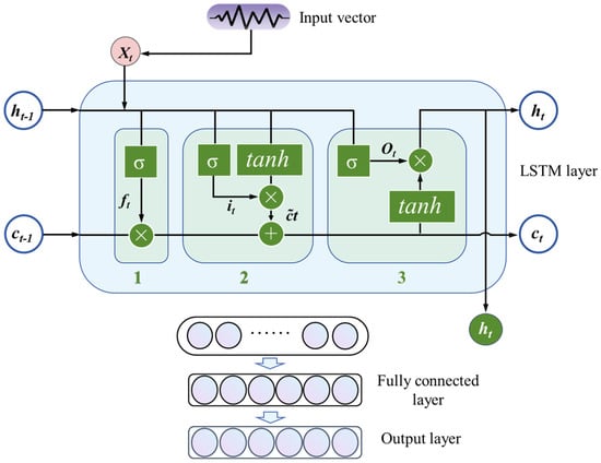 The LSTM layer comprises three main gates: the forget gate, input gate, and output gate, labeled as boxes “1”, “2”, and “3” in Figure 7, respectively. The forget gate decides whether to discard the cell state of previous moment, ct−1, and the input gate calculates the state cell