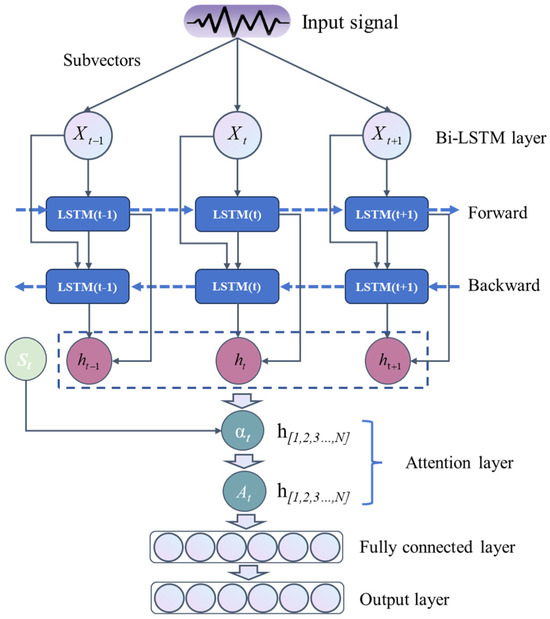 where the function ⊙ is a concatenation function that connects the outputs of the forward and the backward propagation layers through concatenation. and are the hidden states of the forward and the backward propagation layers, which are calculated iteratively according to the forward and the backward sequences of time, respectively. The output At of the attention layer can be calculated by combing all the hidden states h1, h2, …, and hN with weights αt [31],