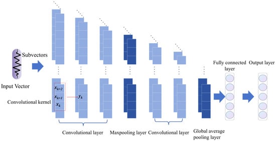 Both terahertz time-domain and frequency-domain signals are one-dimensional sequential data; therefore, 1D-CNN can be employed for feature extraction [32]. 1D-CNN typically adopts a hierarchical structure composed of convolutional and pooling layers. Each of the first three convolutional layers contains 64 convolutional kernels of the size 1 × 3. A max-pooling layer is applied to reduce redundant features. The next two convolutional layers, designed for extracting high-order features, each contain 128 convolutional kernels of the size 1 × 3. A global average pooling layer is employed to mitigate overfitting. The convolutional layer extracts the features of the input vector through the convolutional kernel. SoftMax activation function and the Adam optimizer with learning rate of 0.00001 was applied. Categorical cross entropy was used as the loss function. The 1D-CNN structure is illustrated in Figure 9.