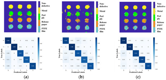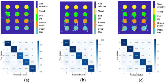 Figure 12 shows the reconstructed images and confusion matrices depicted when the three models were trained and tested by terahertz spectral signals. The results indicate that peel ply and release paper are classified with lower accuracy compared to non-defective and metal. This may be because peel ply and release paper exhibit similar terahertz spectra, leading to weaker distinguishing signals. Consequently, the neural network encounters greater difficulty in distinguishing these two categories accurately. Additionally, a detailed analysis of the confusion matrix reveals specific misclassification patterns. The likelihood of misclassifying PTFE film as release paper is relatively high, whereas the likelihood of misclassifying ‘release paper’ as ‘PTFE film’ is relatively low. This difference in misclassification likelihood can be attributed to the inherent properties of the two materials, which lead to overlapping spectral features and reduced classification accuracy.