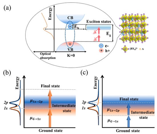(a) Schematic of 2PA associated with exciton of 3D HOIPs. The orange curve represents the linear absorption spectrum, a resonance peak in the linear absorption spectrum clearly demonstrates the presence of exciton with virtually zero momentum. The blue dashed line is a schematic diagram of excitons formed by electron–hole pairs in the momentum space near K point, blue and pink circles depict electrons and holes in sequence, the downward curve in pink is the valence band (VB), and the upward curve in blue is the conduction band (CB). Eb is exciton binding energy. Eg is bandgap. The blue rectangle regions represent the energy levels of excitons. The degenerate two-photon absorption (2PA) process associated with the exciton is shown by the red arrows. (b,c) represent the resonance with the real intermediate states of E1s or the final state of E2p for 2PA transitions, respectively.