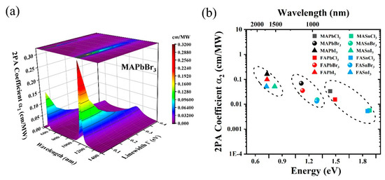 Numerical modeling of (a) 2PA coefficient spectra of MAPbBr3 single crystals depended on wavelength and linewidth. (b) The comparison of the maximal 2PA values of HOIPs at the band edge at room temperature.