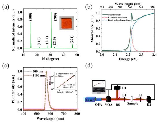 In order to demonstrate the enhancement of 2PA in 3D HOIPs, we conducted the 2PA measurements on MAPbBr3 single crystals. Single crystals of MAPbBr3 were synthesized via an antisolvent vapor-assisted growth method (See Appendix A.1) and then prepared in the size of 4 × 4 × 1 mm3; see an image in the inset of Figure 3a. The grew high-quality, millimeter-sized MAPbBr3 single crystals whose shape conformed to the underlying symmetry of the crystal lattice. The phase purity of the as-grown crystals was confirmed by X-ray diffraction (XRD) from a large batch of crystals (See Appendix A.2). The diffraction peaks of the perovskite are located at 15.45°, 31.06°, and 47.52°, which correspond to the lattice planes (100), (200), and (221), which revealed the characteristics of the perovskite square phase. The XRD pattern in Figure 3a illustrates the well-preferred orientation of MAPbBr3 single crystals, in good agreement with the previously reported results [35]. This indicates our MAPbBr3 samples are of high crystalline quality. To characterize the optical properties of these crystals, both linear absorption (See Appendix A.3) and photoluminescence (PL) measurements were carried out. As shown in Figure 3b, a resonance peak near the bandgap rather than a clear band edge cut off in the linear absorption spectrum clearly demonstrates the excitonic effects in MAPbBr3 single crystals. By fitting the measured linear absorption spectrum with a step function and a Lorentzian function, the optical bandgap of MAPbBr3 single crystals (Eg) is estimated to be 2.22 eV and the exciton binding energy (Eb) is 40 meV. Under an excitation of 500 nm laser pulses, the one-photon photoluminescence (1PPL) spectrum was measured and it exhibits a peak located at the wavelength of 570 nm and with a full-width half-maximum (FWHM) of 22 nm, indicating homogeneity of excitonic state; see the black dotted line in Figure 3c. It is noted that the same PL peak occurs under the excitation of a pulsed laser at 1100 nm, implying that 2PA takes place where individual photon energy is near the sub-bandgap. The inset shows two-photon-excited photoluminescence (2PPL) versus laser intensity on the log–log scale for the crystals at 1100 nm, and a nearly square dependence of 2PPL on the laser intensity.