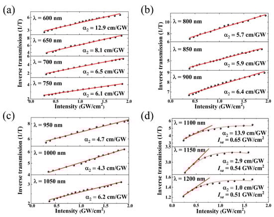 where R is the reduction factor caused by the reflection and scattering. α0 is the linear absorption coefficient and Leff = [1 − exp(−α0L)]/α0 is the effective length of the sample, with L = 1 mm being thickness of the sample. Using Equation (7), 2PA coefficients of MAPbBr3 single crystals are fitted to be in the range of 4.3~12.9 cm/GW, which are on the same order of magnitude as those reported previously at the same wavelength [37,38]. On the other hand, the measured transmission tends to be stable at high light intensity and with excitation wavelengths of 1100, 1150, and 1200 nm; see Figure 4d. This indicates a saturation of 2PA associated with excitonic states that exist below the band edge. These dark excitonic states (or np excitons) provide MAPbBr3 single crystals with 2PA where individual photon energy is below the sub-bandgap. The saturation process of the MAPbBr3 single crystals can be well fitted using homogeneously broadened systems:
