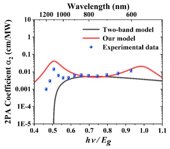 Experimentally measured and theoretically calculated 2PA spectra of MAPbBr3 single crystals. The blue solid dots are experimental data with an error bar of ~20%. The red and black solid lines are calculated by our model and the two-band model, respectively.