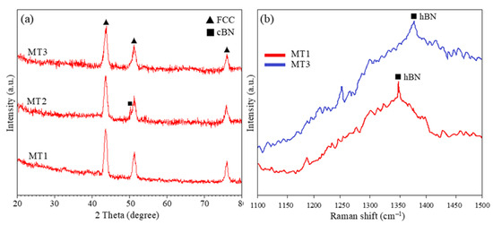 Phase analysis diagram of MT1, MT2, and MT3 coatings: (a) X-ray diffraction pattern and (b) Raman spectrogram.