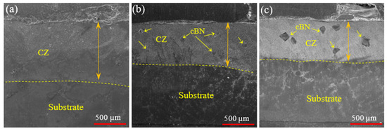 The overall cross-section of the coatings of three samples in Figure 6 shows that the simultaneous presence of hBN and cBN (sample MT3) reduces the thickness of the coating. So, the thickness of MT1, MT2, and MT3 samples is 922 µm, 637 µm, and 591 µm, respectively. It is stated in the literature that adding ceramic materials to metal composites increases the density and thus reduces the thickness of the coating [31]. Microstructural studies showed that cBN particles are scattered and visible in the coating, while hBN particles are hardly visible. This is attributed to the fineness of the initial hBN particles, about 5 μm.