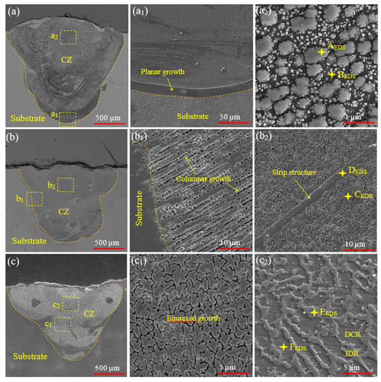 Cross-sectional SEM images of the coated area of samples (a) MT1, (b) MT2, and (c) MT3. (a) shows the overall coating profile, while (a1,a2) are magnified views of the marked areas in (a). Similarly, (b1,b2) correspond to the overall coating profile and magnified views of MT2, respectively, and (c1,c2) show the overall coating profile and magnified views of MT3.