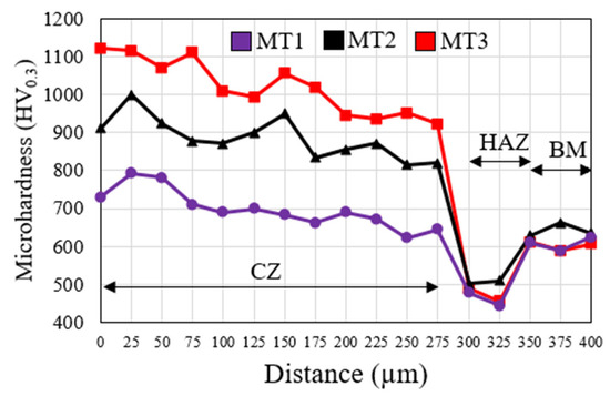 The hardness measurement behavior of the three types of coatings at different intervals is presented in Figure 9. As can be seen, the lowest and highest hardness values belonged to the sample MT1 with an average hardness of 692 HV0.3, and MT3 with an average hardness of 992 HV0.3, respectively. hBN does not cause high hardness due to its inherent layered structure. On the other hand, with the presence of columnar dendrites, loose morphology, and the low volume fraction of equiaxed crystals, the hardness value in sample MT1 is lower than the other two samples. The hardness results of the MT2 sample (907 HV0.3) show an impressive 24% increase in hardness compared to the MT1 sample. Such a result was not far from expected. Because cBN is the hardest material after diamond, its hardness is several times that of hBN, as reported in the literature [35]. The high hardness of cBN induces the driving force of inhomogeneous nucleation in the molten pool, which reduces the size of dendrites and grown crystals. However, the hardness of the MT3 sample is about 10% more than the MT2 sample. This increase in hardness due to the addition of hBN is attributed to the decomposition of hBN during laser cladding, resulting in the formation of Cr-rich borides and creating more inhomogeneous nucleation centers. Therefore, adding cBN to the coating has a significant effect on increasing the hardness compared to hBN.