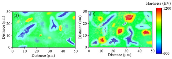 Contour plots of hardness distribution: (a) MT1, (b) MT2.