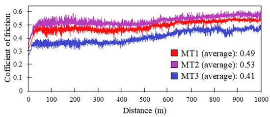 Diagram of the coefficient of friction of samples MT1, MT2, and MT3 based on the distance traveled.