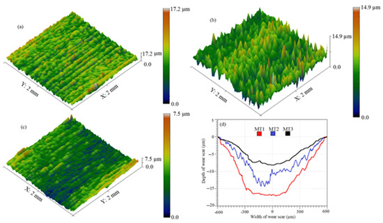 3D profiles of worn surface, (a) MT1, (b) MT2, and (c) MT3, (d) wear scar in different coatings.