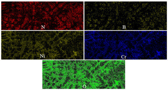A map analysis was prepared from these particles to check the distribution of cBN and hBN particles, as shown in Figure 8. The particle size of cBN and hBN was not homogeneous due to their inherent structural differences. cBN particles are typically larger due to their high hardness and cubic structure, whereas hBN particles are smaller because of their layered and lubricating nature. Investigations show that both cBN and hBN particles decompose during laser processing. So, cBN particles with an initial average size of about 100 µm have been transformed into particles with an average size of 20 µm in MT2 coating. Meanwhile, the hBN particles, due to their smaller initial size (5 μm), have broken down into particles with an average size of 200 nm in the MT1 coating (Figure 8a). So, the cBN particles did not create any combination with Cr and Ni elements (Figure 8b). Still, the hBN particles penetrated to some extent to the above two elements. They formed a matrix rich in B and N elements around the hBN particles. The EDS analysis of cBN particles in Figure 8b shows that the N element often penetrates around the cBN particle, strengthening the cBN adhesion to the matrix.