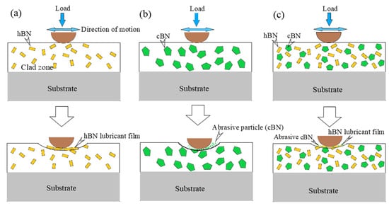 By reviewing the literature, it has been determined that two methods can increase the wear resistance of coatings applied by laser cladding: first, adding self-lubricating materials such as WS2, MOS2, hexagonal boron nitride (hBN), and SiC to the composite, second, adding hard ceramic materials like WC, cubic boron nitride (cBN), TiC, and ZrB2 [18,19]. The hBN solid self-lubricating material has become a popular friction reduction additive among researchers due to its low density, outstanding automotive performance, excellent thermal stability, and good thermal conductivity [20]. Unlike MoS2 and WS2, which oxidize at high temperatures and lose their lubricating properties, hBN remains stable up to much higher temperatures [21]. MoS2 and WS2 are oxidized in oxidizing environments and high temperatures to MoO3 and WO3, which have no lubricating properties. In contrast, hBN has higher chemical stability and is less susceptible to degradation in high-temperature environments [22]. On the other hand, due to its very high hardness, cBN is considered a suitable material for resisting friction in grinding pairs. Additionally, its low density and excellent thermal properties further enhance its performance [23]. As a result, hBN and cBN improve wear resistance through two different mechanisms. In addition to hBN and cBN, other self-lubricating materials, such as graphite, metal fluorides, and novel composite lubricants, have also been explored for wear reduction [24,25]. However, hBN offers superior thermal stability compared to graphite. At the same time, cBN provides significantly higher hardness than most other solid lubricants, making them particularly effective for high-temperature and high-load applications.