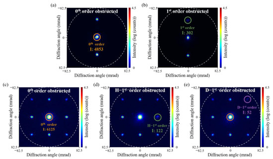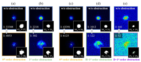 Validation of diffraction orders with and without particle obstruction using diffraction patterns: (a,b) Zeroth- and first-order diffracted light of V-L/S patterns with and without particle obstruction, respectively. (c–e) Zeroth-, H-1st-, and D-1st-order diffracted light of C/H patterns with and without particle obstruction, respectively. ‘I’ denotes the maximum intensity of each diffraction order. Small insets show the shapes and sizes () of each diffracted light with and without obstruction at the CCD.