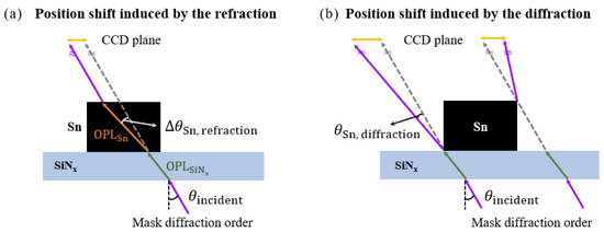 (a) Schematic of mask diffraction position shift induced by refraction. The refraction angles at SiNx and Sn were determined based on the incident mask diffraction angle and Snell’s law. Green and orange lines represent the optical paths through the membrane and Sn particle, respectively, while the gray dashed line indicates the path without the Sn particle. (b) Schematic of mask diffraction position shift resulting from particle-induced diffraction. The diffraction angle was determined by the incident mask diffraction angle, as defined using Equation (2). The thicknesses of Sn and SiNx were exaggerated for visualization purposes.
